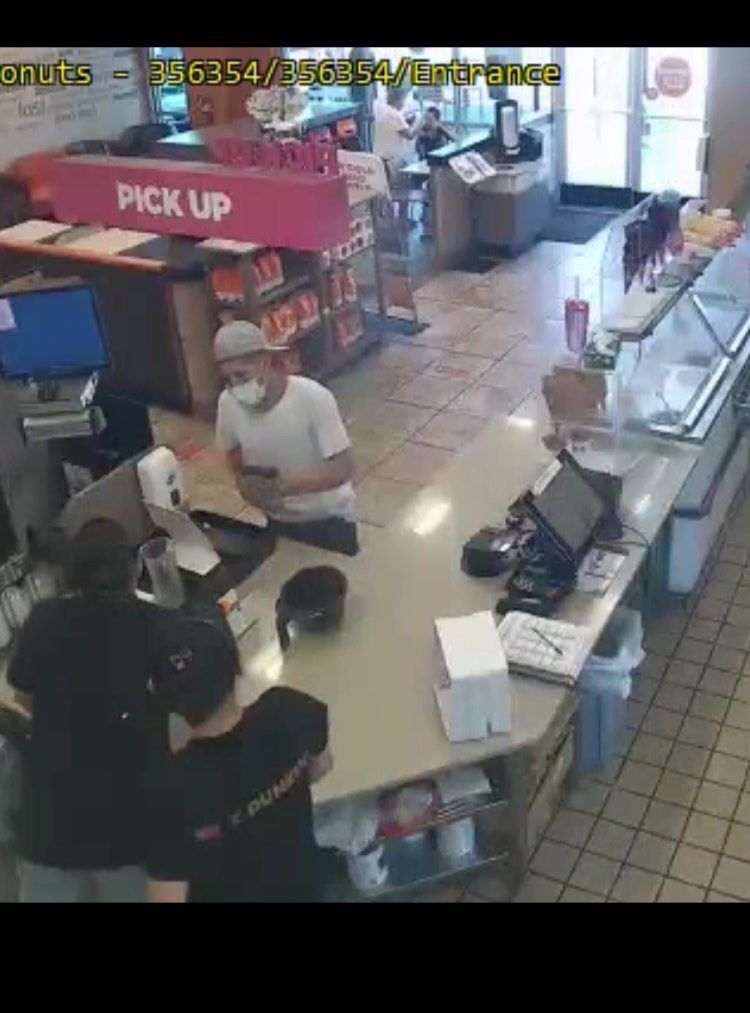 On Thursday at 10:22 a.m., the man, who was armed with a handgun, robbed the Dunkin located at 3200 La Orilla NW. He was wearing a white T-shirt, tan hat and white face mask. He fled in a dark gray Saturn.