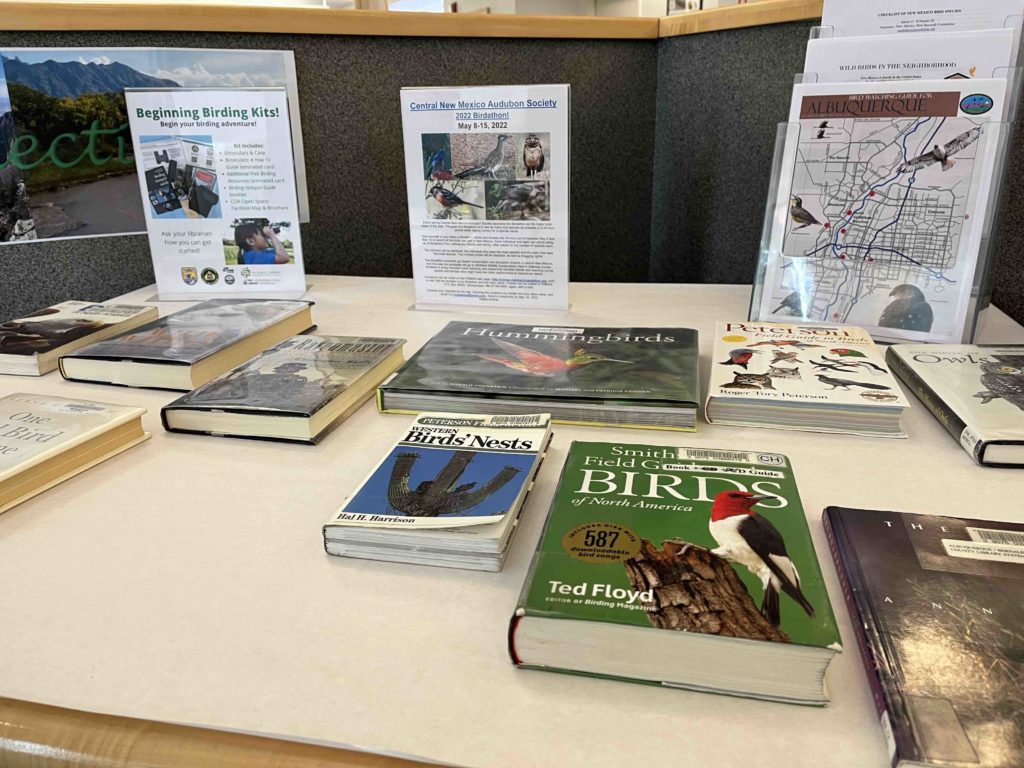 The library offers several books and field guides to help participants identify visiting and native bird species. Bird watching kits are also available for checkout at the Cherry Hills library and other libraries in Bernalillo County. The library asks participants to start a notebook to record dates and times each bird is observed. “After a year of record keeping, you’ll have a much better idea who your annual avian visitors might be,” the front side of the Bingo card says.