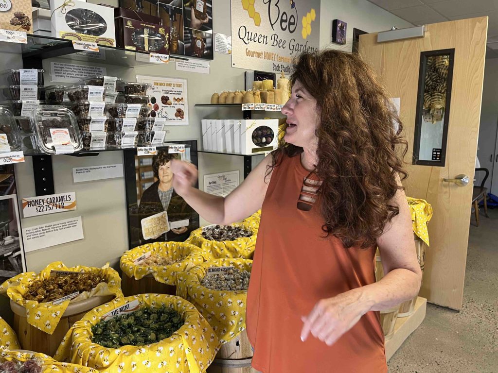 For those who only came for the candy, Amethyst can show you where to get the good, healthy stuff. Inside the studio, at the east end of Amethyst, is Queen Bee Gardens, a shop full of chocolates and taffies that use honey as the sweetener, although sugar is added to some of the products. The assortment of taffy flavors includes blue raspberry, strawberry lemonade, mint, and caramel, among others. Honey-infused chocolate truffles include cherry, sea salt, coconut almond and many other flavors. The shop also has candles, lip balm, cuticle cream, salves, bee pollen and, of course, honey.