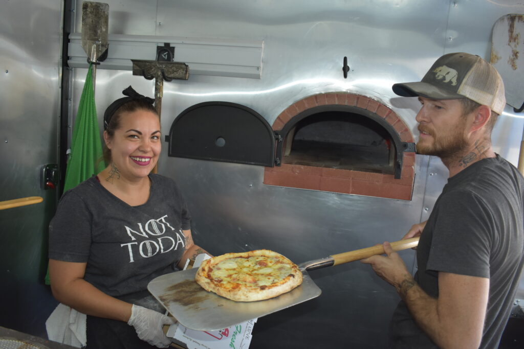 Love At First Slice is located right next to Furniture 42 and Gnomad Coffee. The pizza food truck is co-owned by Lennon, Brian Brocksmith and Brandon Psomas. The three also co-own Gnomad Coffee.