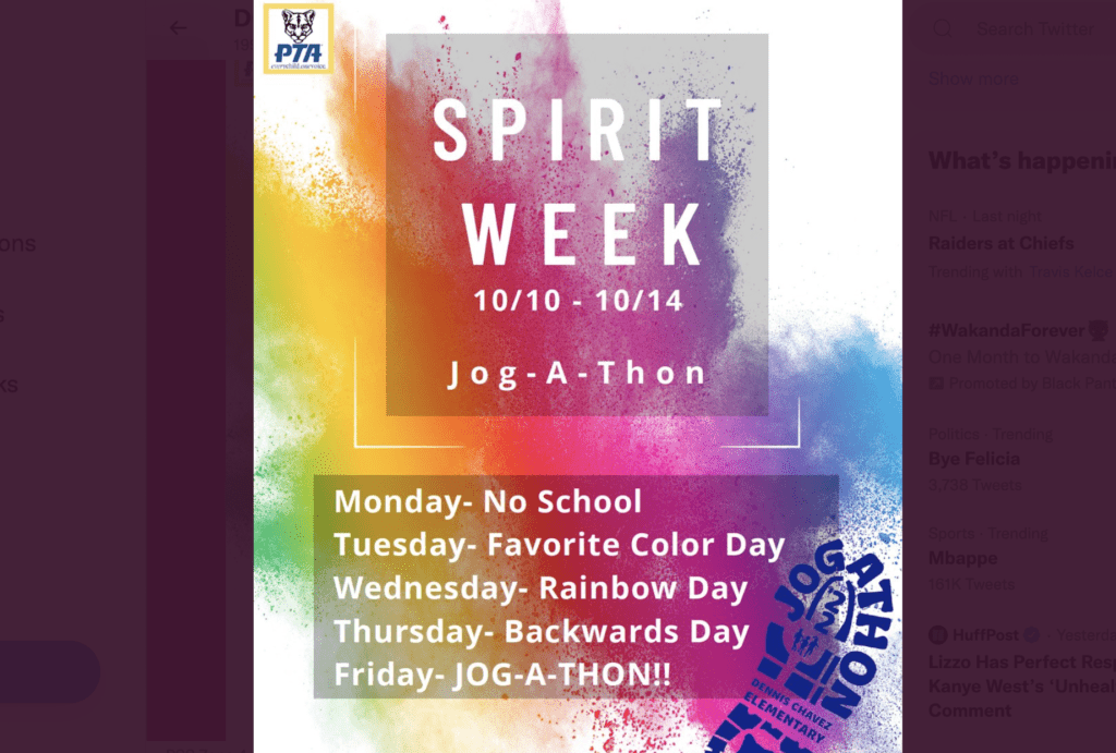 The Panthers continue showing off their school spirit with Rainbow Day on Wednesday, Oct. 12, followed by Backwards Day on Thursday, Oct. 13, and then they end the week with a Jog-A-Thon Friday, Oct. 14.
